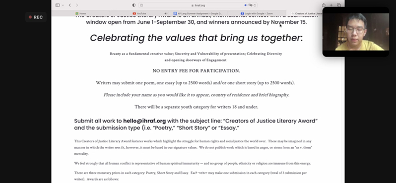 On September 2nd, our writing club held its scheduled meeting to discuss the Creators of Justice Literary Awards. The meeting started with James providing a comprehensive overview of the award and introducing to our members the kind of responses the competition is seeking. After his detailed introduction, our member Amelia, made a great contribution by tossing a series of inspiring questions about the competition. Her inquiries not only lit up our discussion but also prompted us to critically think about our approach to the competition.